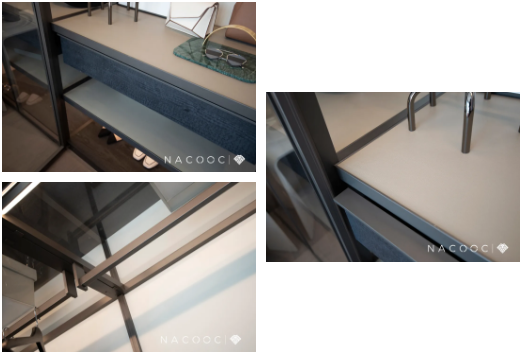 衣柜采取玻璃门设计,增加了通透性和展示性,同时带有多个收纳格和层板设计,将柜体内部做了细分,轻松解决衣服、鞋子、包包和私密物品的收纳问题。